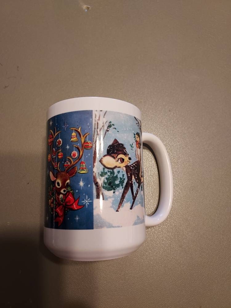 Indulge in the festive charm of yesteryears with our Retro Reindeer ceramic glossy mug, featuring a collage of four delightful midcentury Christmas prints! Crafted with care and attention to detail, each mug showcases a unique design that adds nostalgic flair to your holiday season.