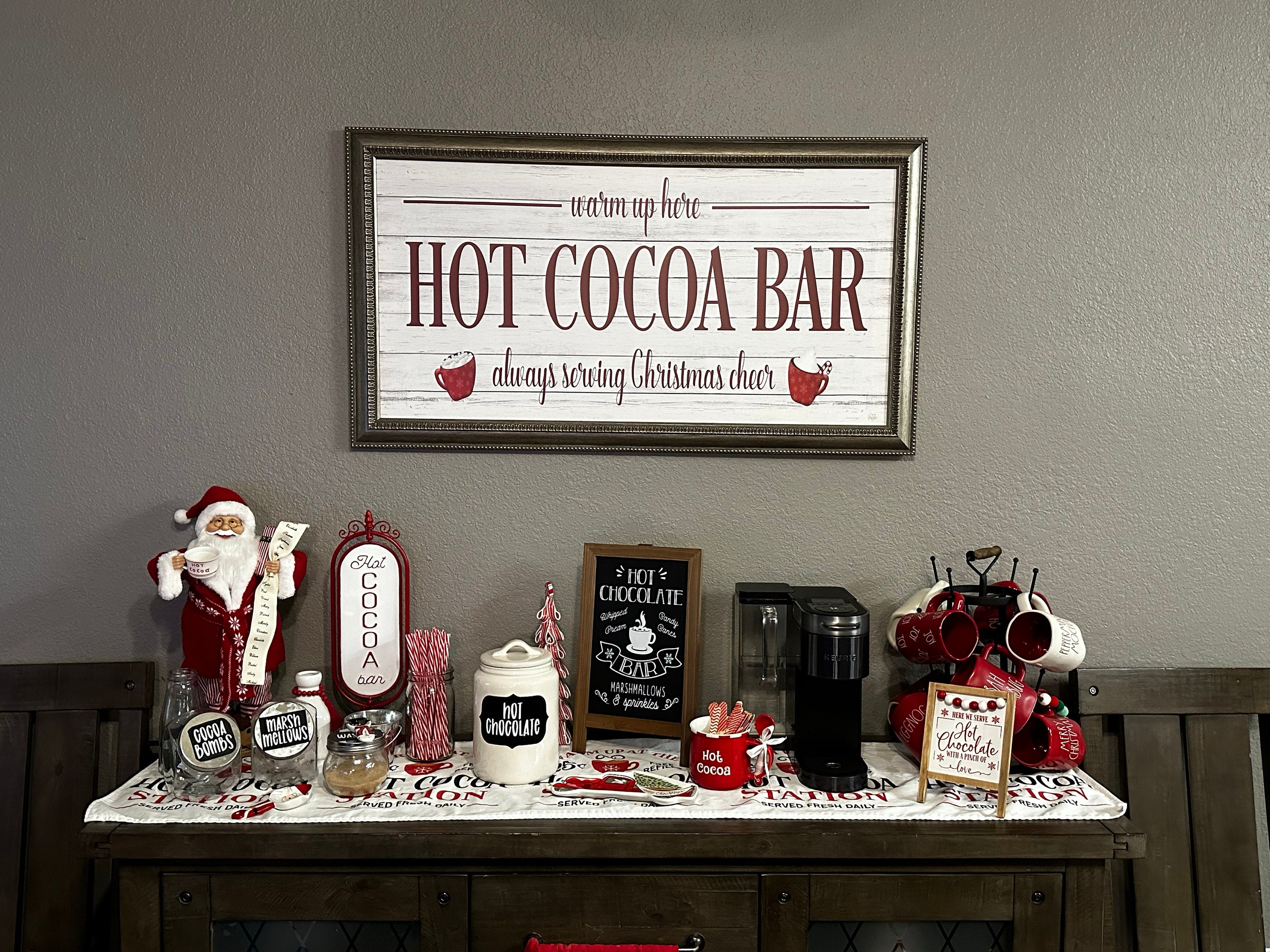 One-sided print featuring a "Warm Up At The Hot Cocoa Station" design, perfect for a coffee or cocoa bar