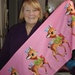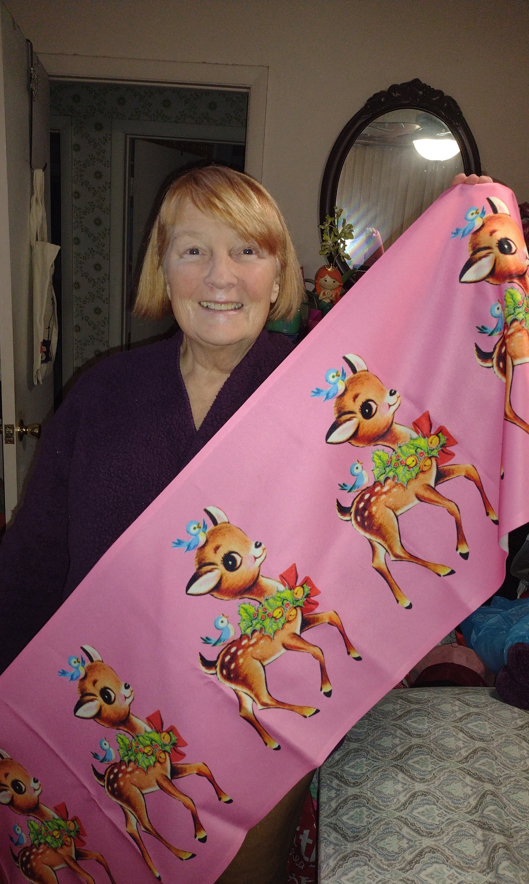 One-sided print featuring a midcentury reindeer and bluebird design on a pink background